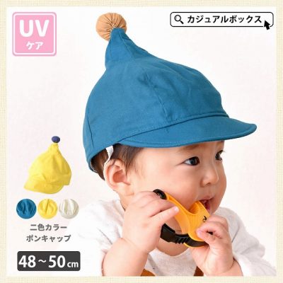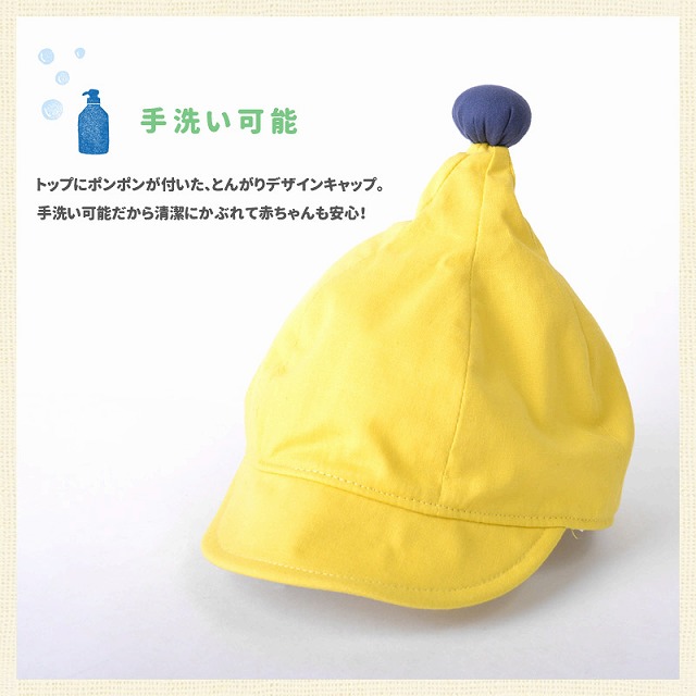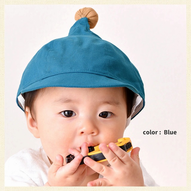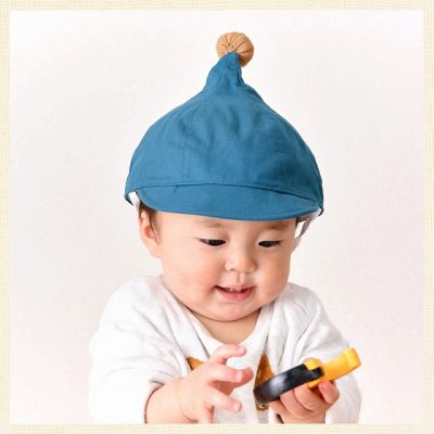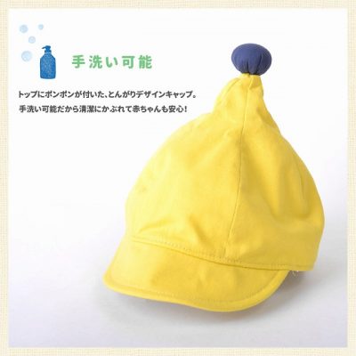 トップにポンポンが付いた、とんがりデザインキャップ。
