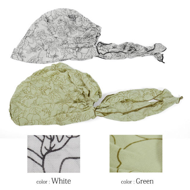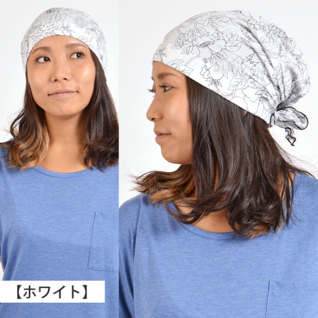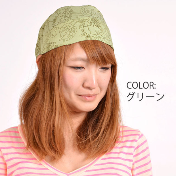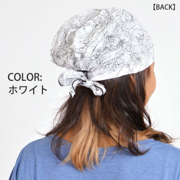 もちろんサイズもフリーサイズで頭の小さい方から大きい方までOK! ただかぶって後ろでくくるだけですので、 本当に簡単でお洒落なアイテムです。 蝶々結びにしてすっきりさすも良し、軽く一重にだけ結んでたらしても雰囲気があっていいですね。