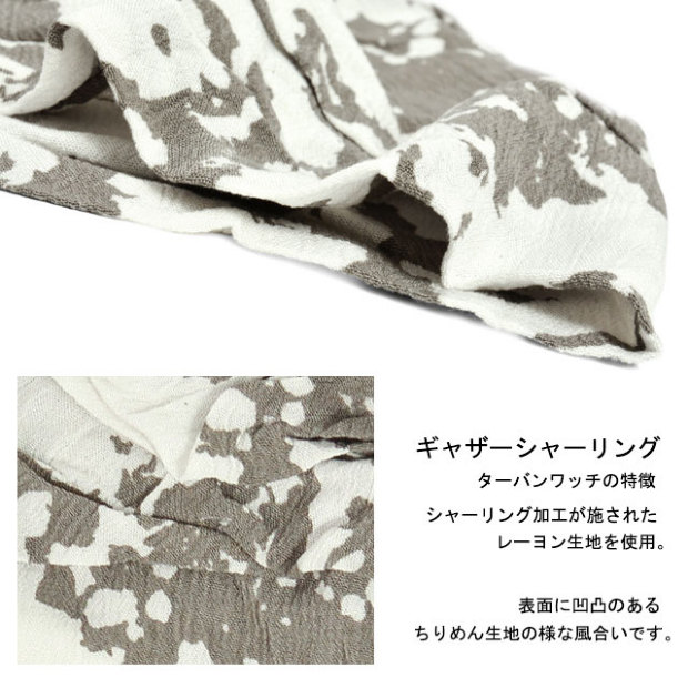 襟足部分にはギャザー加工を施しゴムを通してありますので、 レーヨン独特のシャーリング感・ドレープ感が 綺麗なシルエットを演出、被った時の形が決まります。