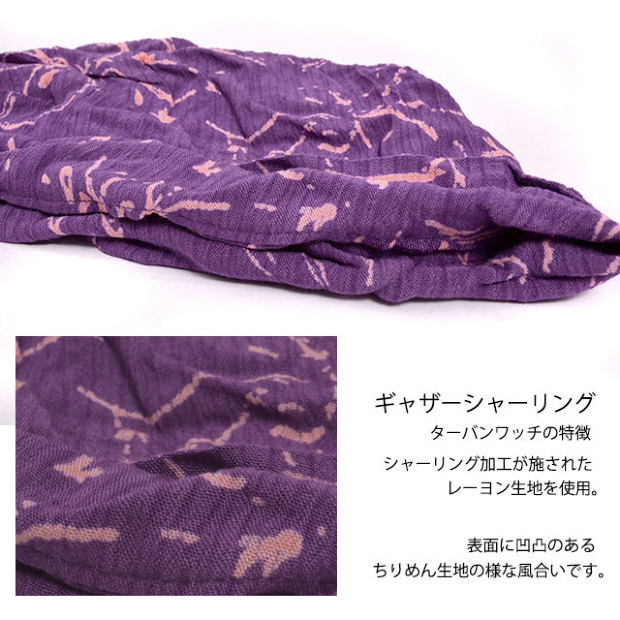 襟足部分にはギャザー加工を施しゴムを通してありますので、 レーヨン独特のシャーリング感・ドレープ感が 綺麗なシルエットを演出、被った時の形が決まります。