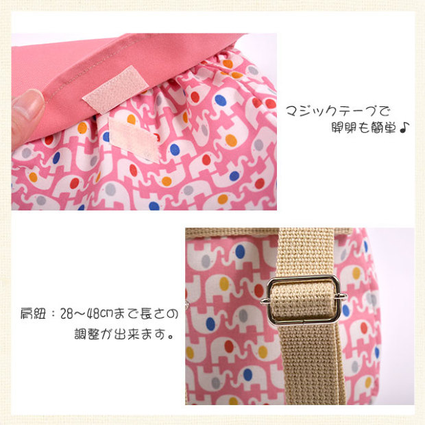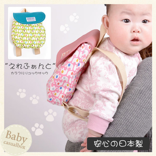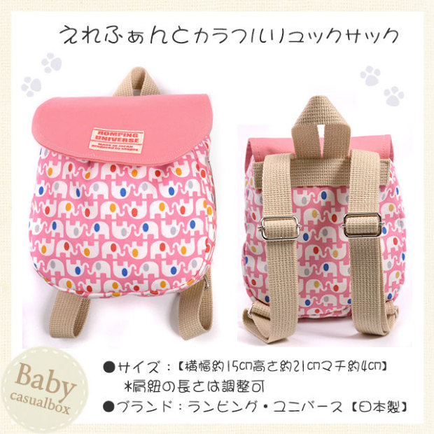 | 大人気のベビーリュックサック。 男の子も女の子もかわいいゾウさん柄。 もちろん可愛さだけでなく、しっかりとマチもついており ベビーも自分のお菓子を背負ってお出かけ♪ 1歳前のヨチヨチ歩きのベビーにも安心な柔らか素材。 肩ヒモの長さも調整が可能なので、成長の早いベビーにもピッタリ!! 安心の日本製は出産祝いなどのギフトにも喜ばれますね♪ |