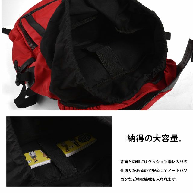 | ナイロン素材で使いやすくしっかりした大容量のリュックサックが登場。 前面には大きな大きなポケットに左右にも大きいポケット。 ふた部分もポケットとして収納も可能。 左右のポケットにはイヤホンを出せる穴つきで線が絡まって わずらわしい思いをすることがありません。 開閉はしっかりした2つのバックル。 荷物の出し入れがしやすいように背中部分にもファスナーつき。 背面と内側にはクッション素材入りの仕切りがあるので 安心してノートパソコンなど精密機械も入れれます。 リュック安定するようにショルダーベルトつき。 大容量で普段使いから旅行かばんに色々使えるオールマイティーなリュックサックです。 |