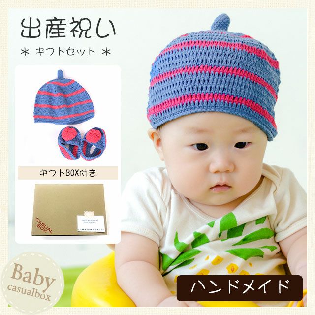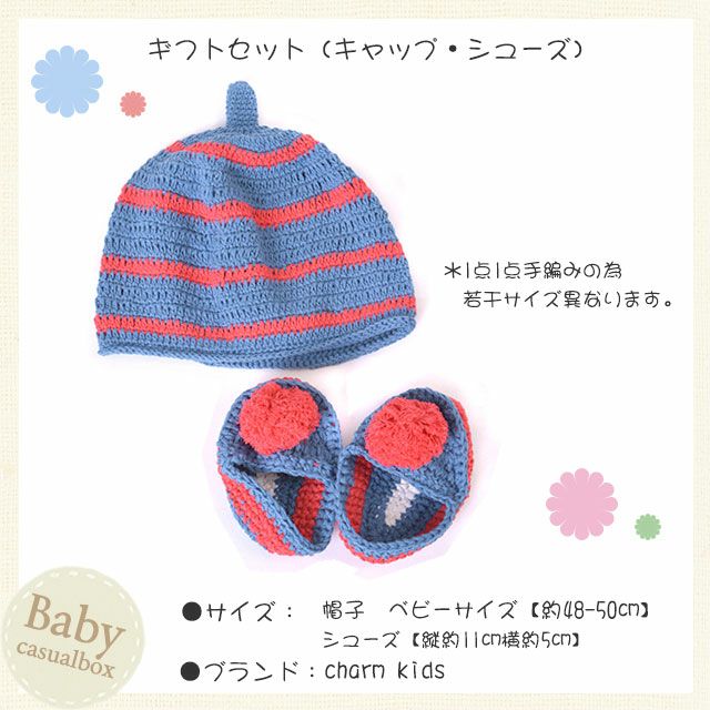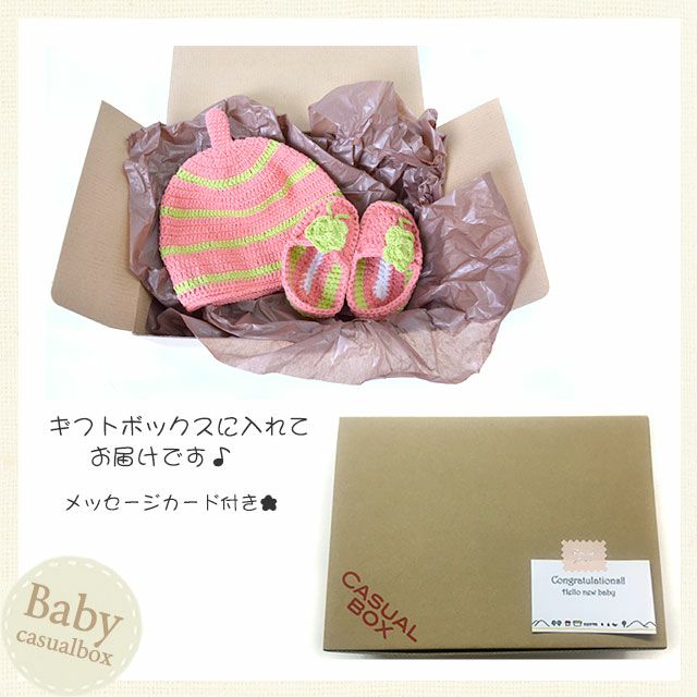 | ★ラッピングBOXにメッセージカードをつけてお届け★ どんぐりみたいなかわいいニット帽にベビーシューズがセットになった ギフトセット。 他には置いていない1点1点手編みのセットに、男の子カラーと 女の子カラーの2色展開。 ころんとした丸いシルエットで見た目もかわいい帽子と、 玄関に飾っておくと幸せが訪れるといわれるファーストシューズ。 そのままプレゼントしやすいように、ギフトボックスにいれて お届けします。 コットン100%なので肌にも優しく喜ばれること間違いなしですね。 |