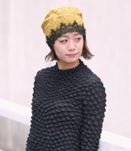 マスタード色のヘム レース デザイン ワッチをかぶる女性