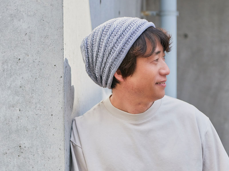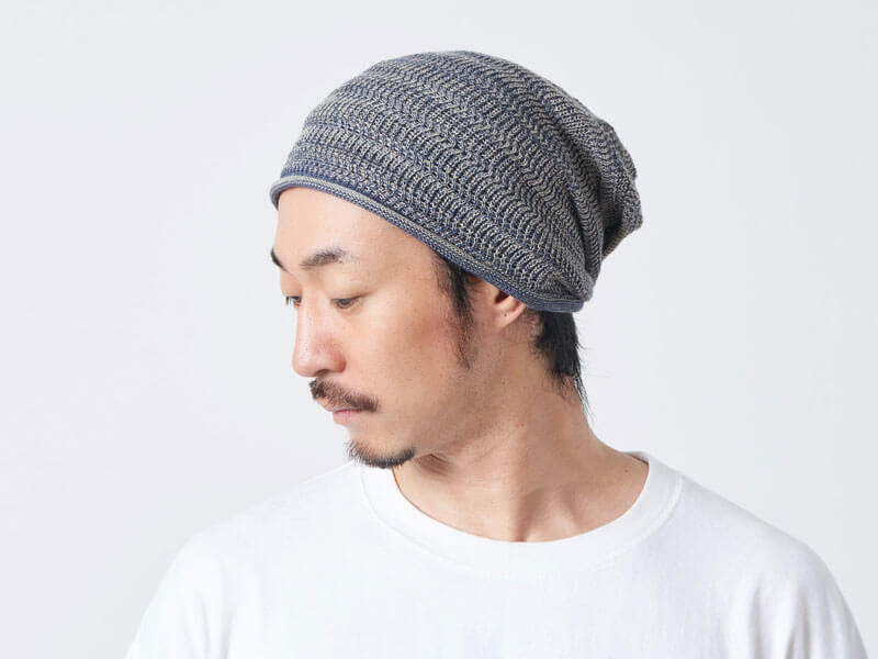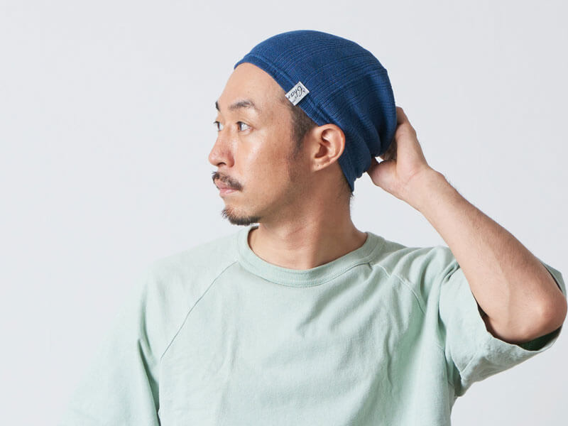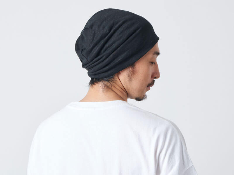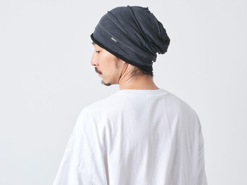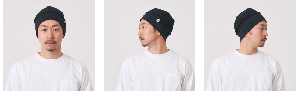 折り返して頭のラインに合わせてかぶることで、顔の輪郭が出すぎずバランスのとれた仕上がりに。