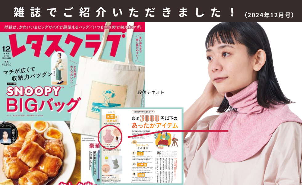 優しい肌触りで首元からデコルテ周りを包み、通常使いから外出にも、就寝時にも使えるアイテム。