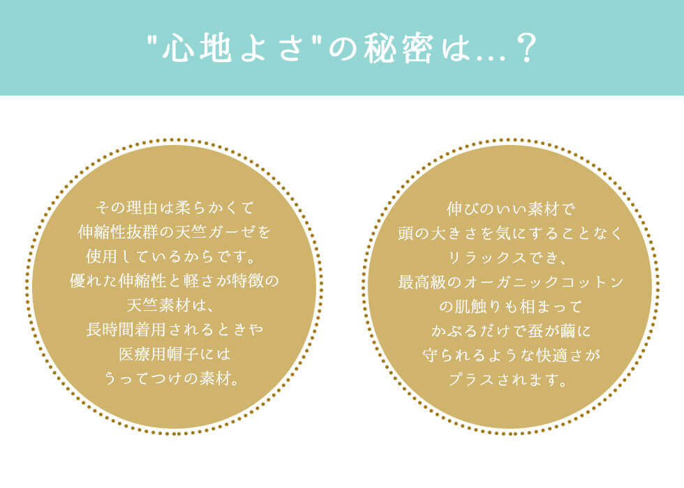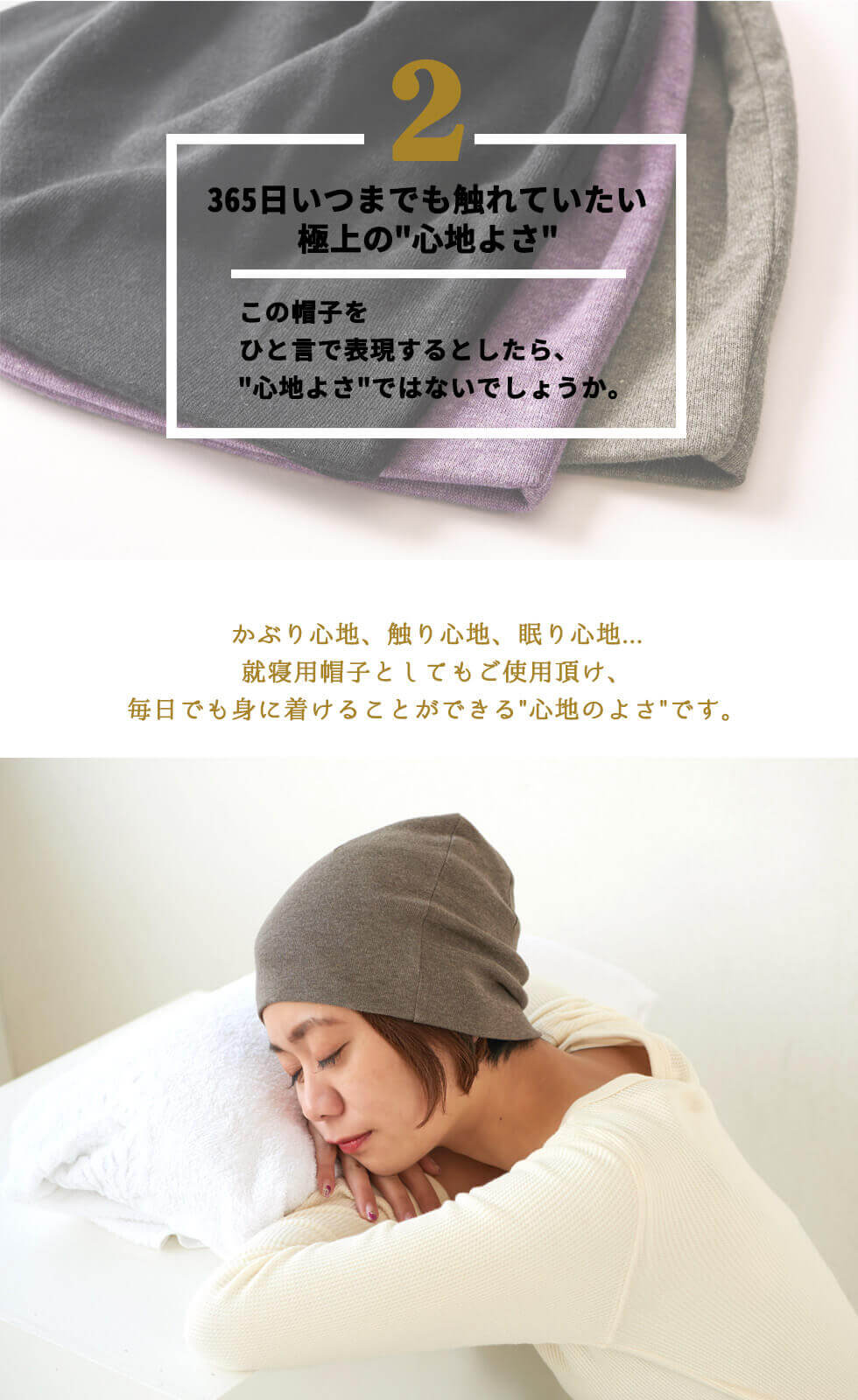 室内帽子、就寝用帽子など、長時間着用時でも安心です。