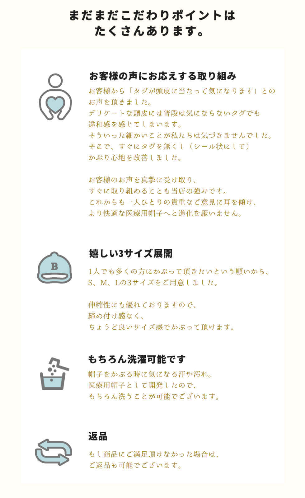 刺激に敏感になる頭皮や頭部手術後の保護キャップとして、医療用帽子にも最適なアイテム。
