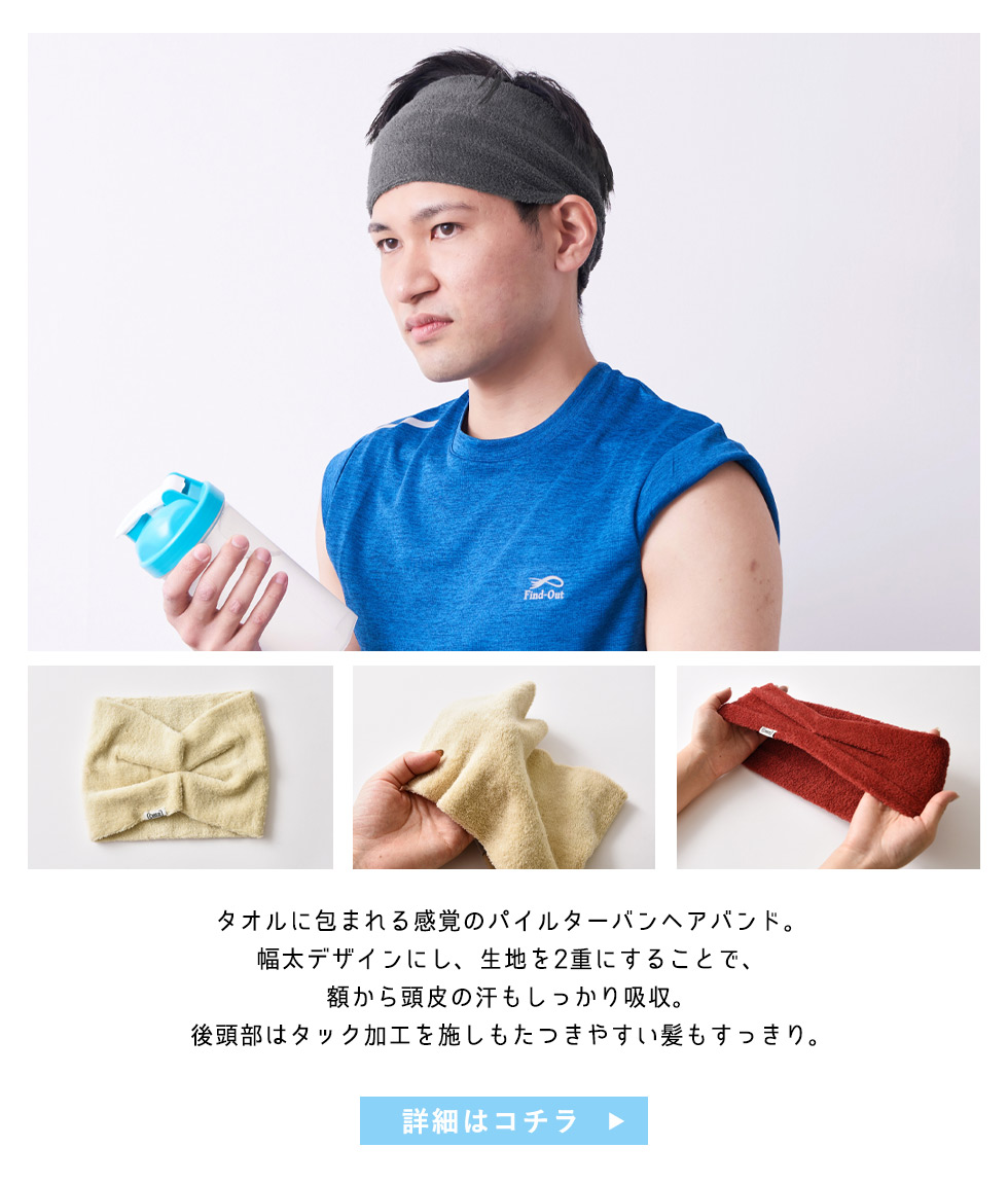 ヘアバンド部門人気NO,1アイテム!タオル素材で幅広のヘアバンドがおでこに密着し、汗をかいても抜群の吸水力でしっかり汗を吸い込みます。